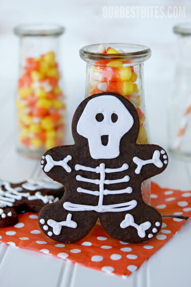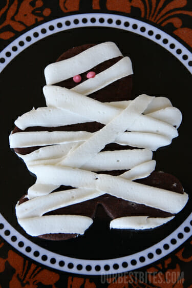 Okay, and here’s possibly the best tip in this post. Let’s say you make your cookies, you do your icing, and somehow you find yourself cursing OBB and their stupid adorable skeletons because yours aren’t turning out quite like you had hoped. Or you realized you just don’t have the time to pipe rib cages onto tiny chocolate men but you don’t want to waste your cookies. Well then I have a plan B for you. Just drizzle icing back and forth all over and dot on two eyes. Tah-dah! Mummy Cookies 🙂
