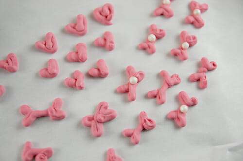 - To make hearts and bones/bows, use food coloring to tint icing to desired color. Pipe designs onto parchment paper and let dry until hard. Gently remove from parchment and attach to cookies with a dab of wet icing.