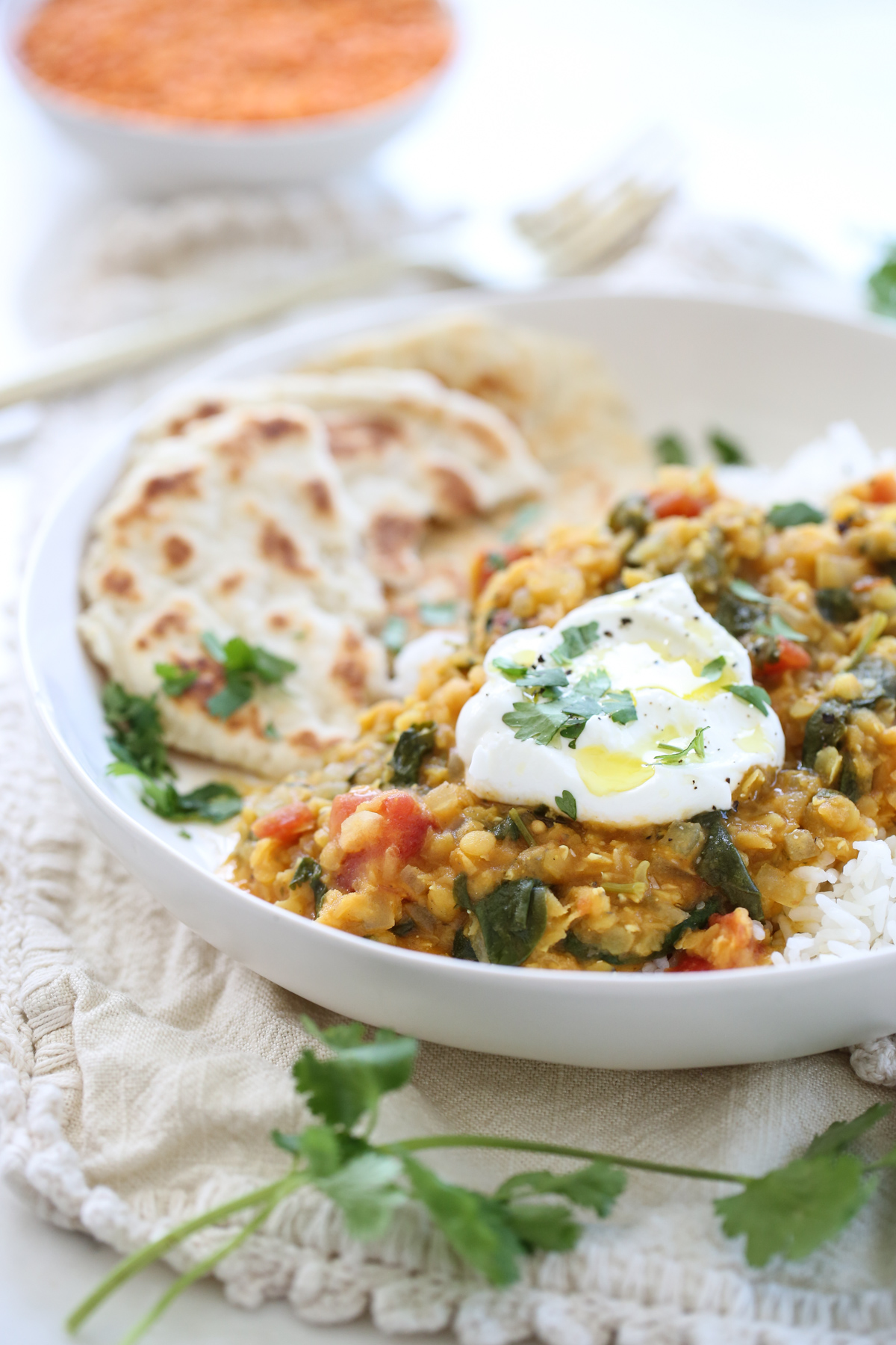 These Indian-Spiced Lentils are hearty and delicious and loaded with comforting flavors. If you’re not familiar with red lentils, they’re rich in fiber, protein, and nutrients and super quick cooking. This meal can be on the table in under 30 minutes when made on the stove top, or tossed in a slow cooker for later if you prefer that method. It’s delicious on its own, or served with some steak, chicken, or shrimp on the side. We love it over hot white rice with a dollop of plain yogurt. My kids all love it scooped up with Naan or these Easy Yogurt Flatbreads.