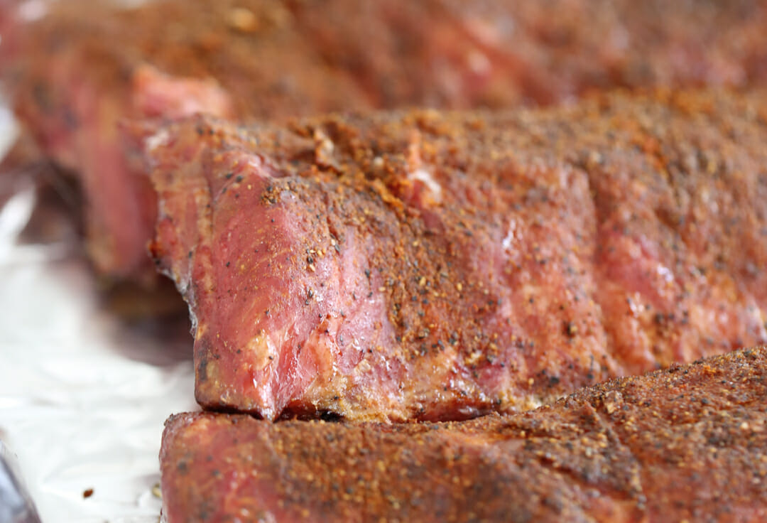 - The next thing you need is a dry rub. I shared my rub recipe a couple weeks ago, here it is if you missed it! Rub it all over both sides and gently pat in.