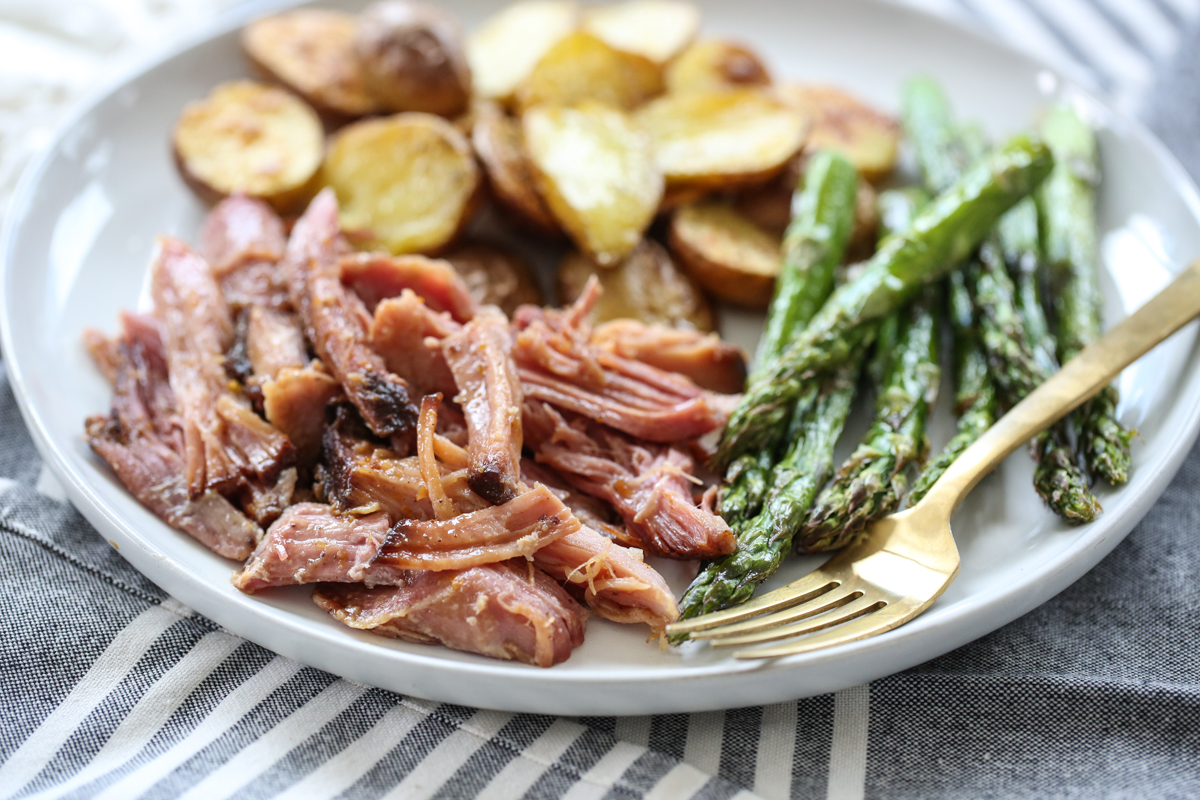 For quick serve reheating of leftovers, you can zap it in the microwave or toss in a saute pan over medium heat to get it a little caramelized. If you’re reheating it in its entirety for serving, reserve the step where you toss with extra glaze until right before serving. Store shredded ham in an airtight container in the fridge. When ready to reheat, I like to place in a baking or roasting pan, drizzle with a small amount of liquid (water or broth…) just to avoid drying out, and cover with foil. Reheat at 350 degrees until hot- timing depends on the quantity, keep an eye on it. Toss with extra glaze before serving, if desired.