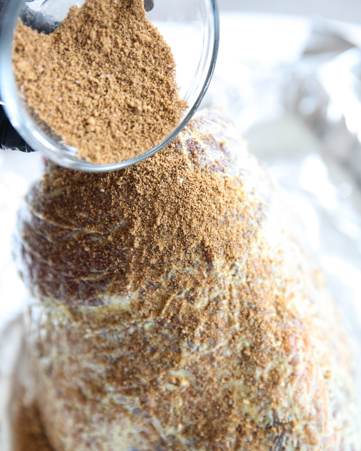 - Sprinkle all over: Cover the ham with the seasoning rub. As the mustard starts to absorb the spices, it will start to look wet all over.