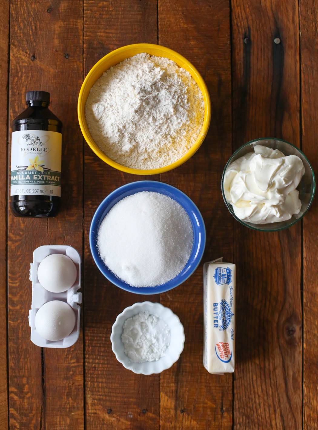 - In the bowl of a stand mixer or using an electric hand mixer and a large mixing bowl, combine the softened butter, eggs, vanilla, and sugar. In a small mixing bowl, whisk together the flour, baking soda, salt, and baking powder.