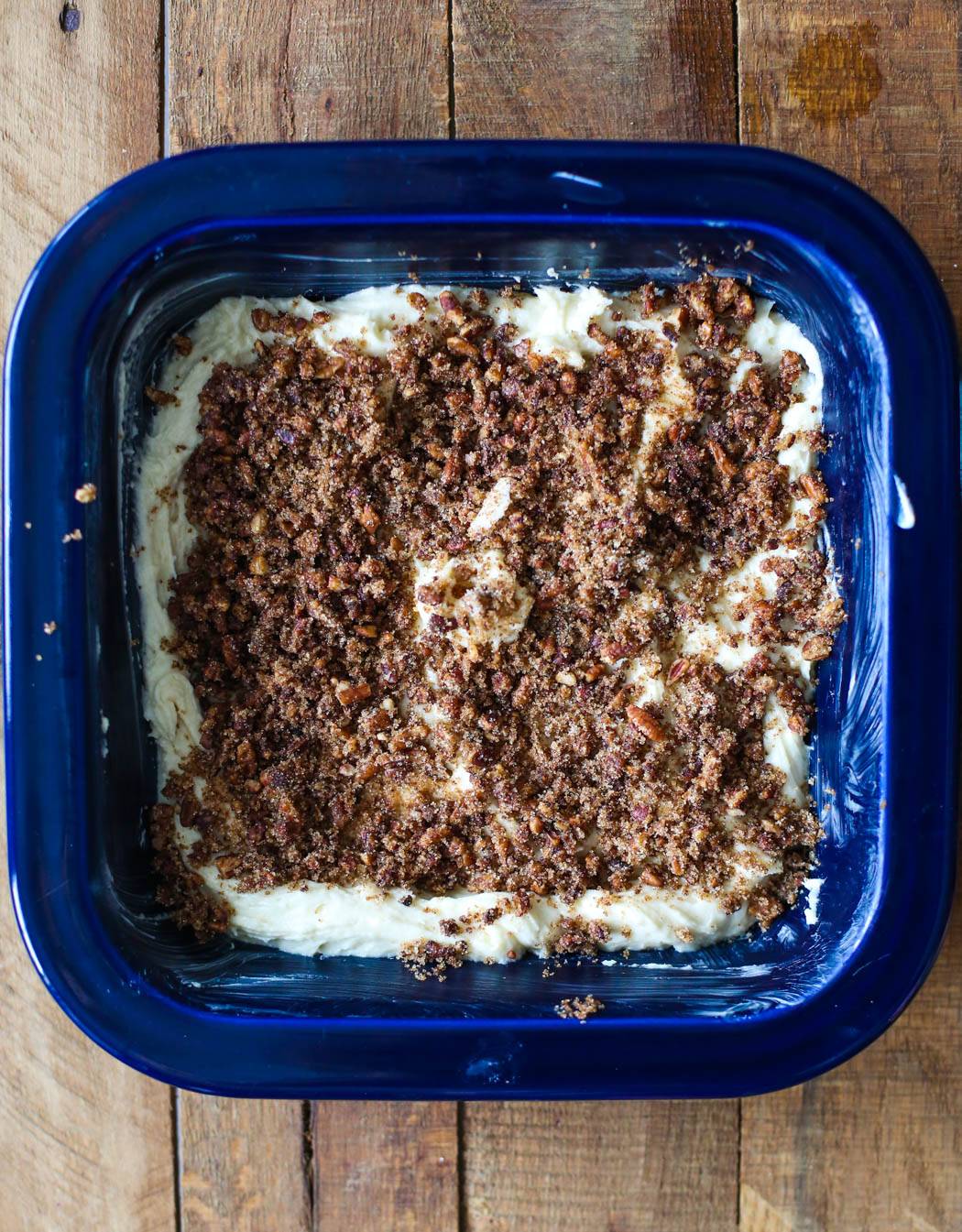 - Spread half of the batter into the prepared pan. Sprinkle half of the topping mixture over the batter, then spread the remaining batter on top and sprinkle with the remaining topping mixture.