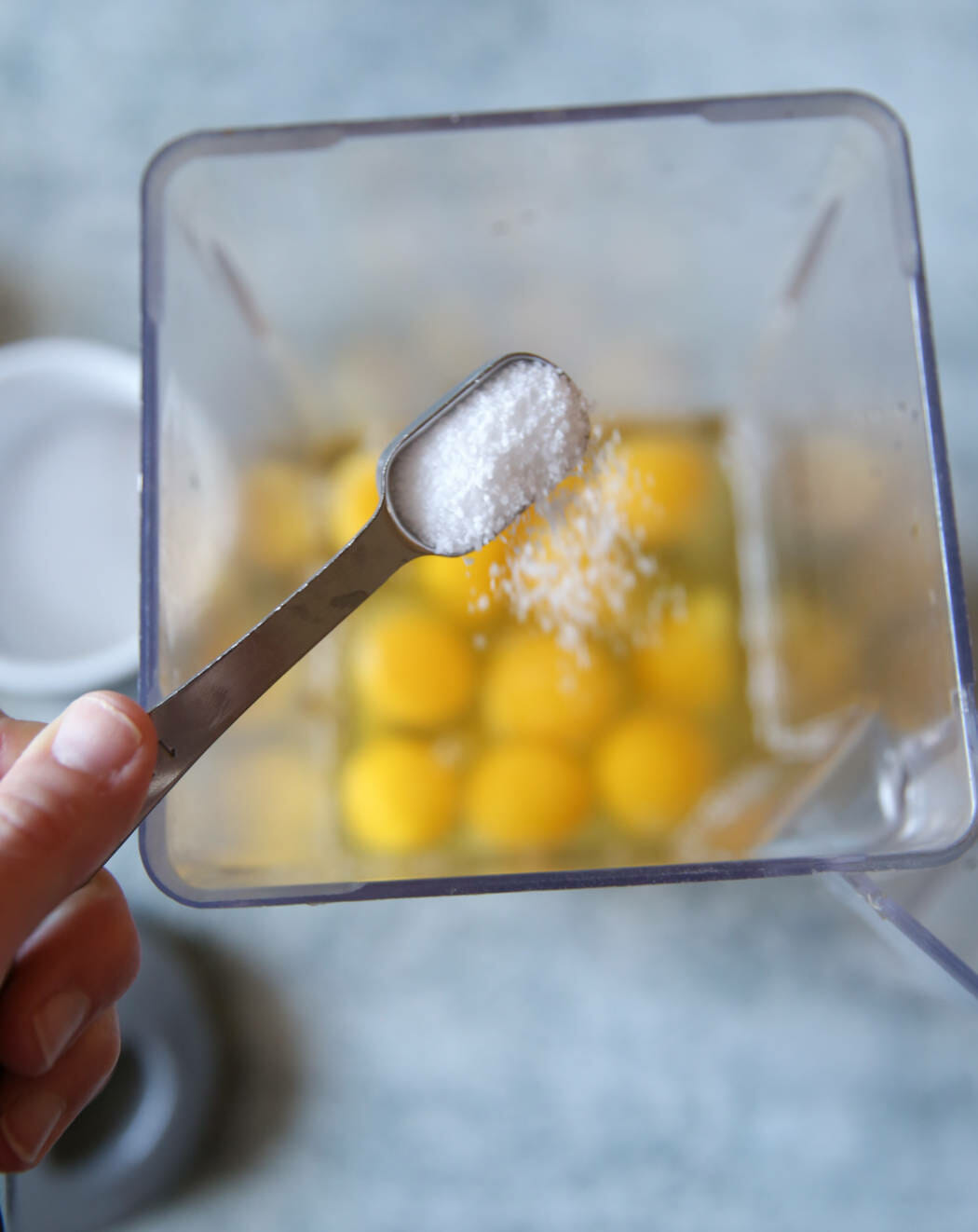 - Crack the eggs into the jar of a blender and add the salt, pepper, onion powder, and heavy cream. Pulse until combined and set aside.