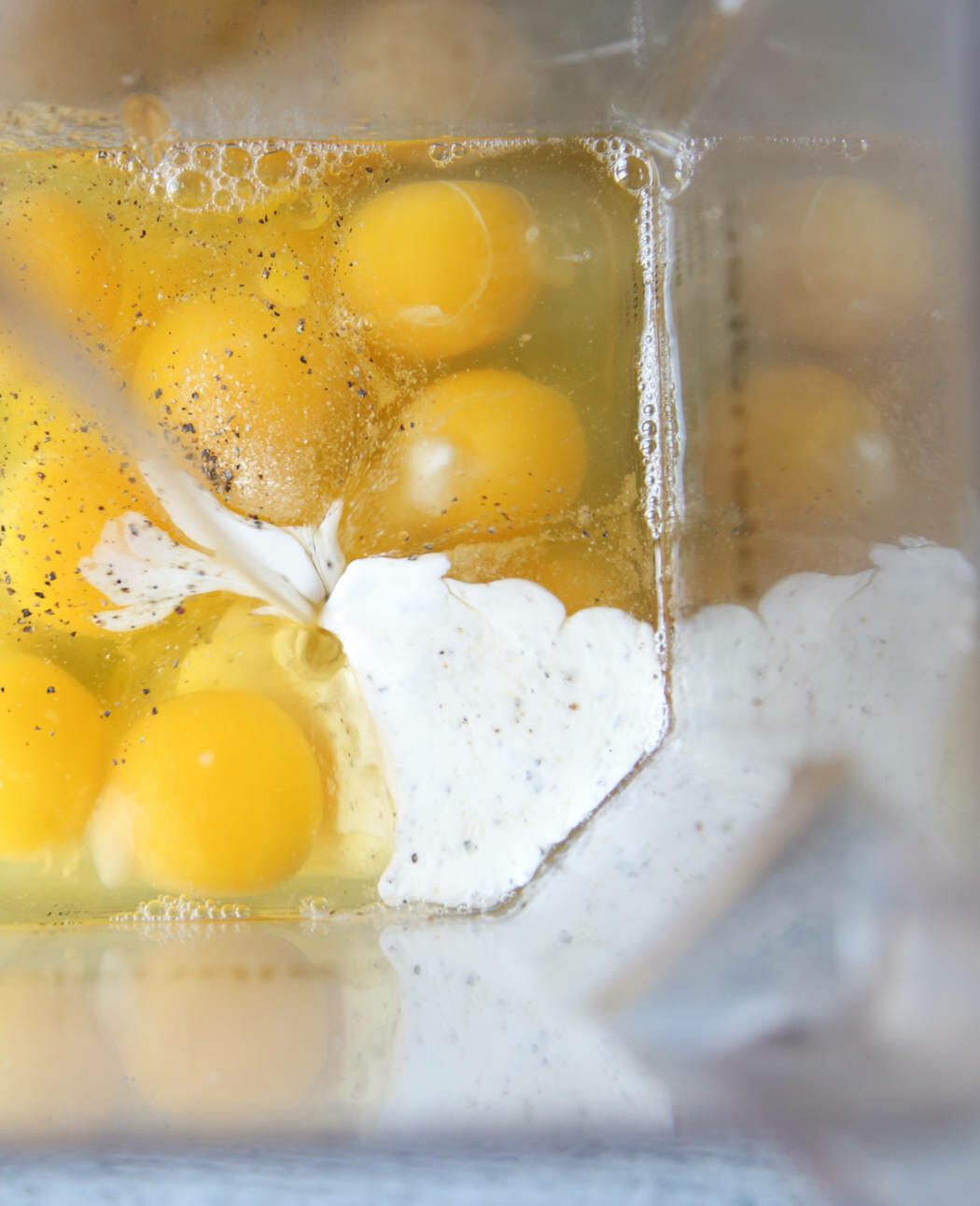 - Pulse some eggs in the jar of a blender with salt, pepper, onion powder, and heavy cream.