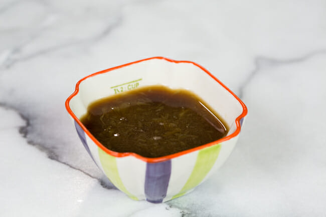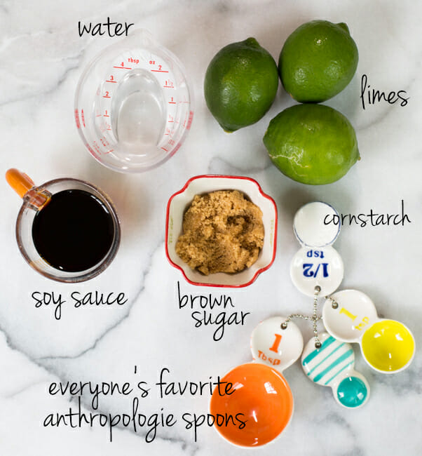 To get started, you’re going to make the sauce for the stir fry. You’re going to need water, freshly squeezed lime juice, brown sugar, soy sauce, and corn starch. Oh, and the measuring spoons–the last time I posted a picture with these measuring spoons in it, people went crazy. I got them from Anthropologie, and while they don’t have the exact same colors anymore, they have a similar set here. Happy…end of March? Sure. That’s a thing.