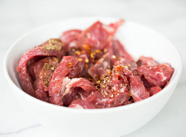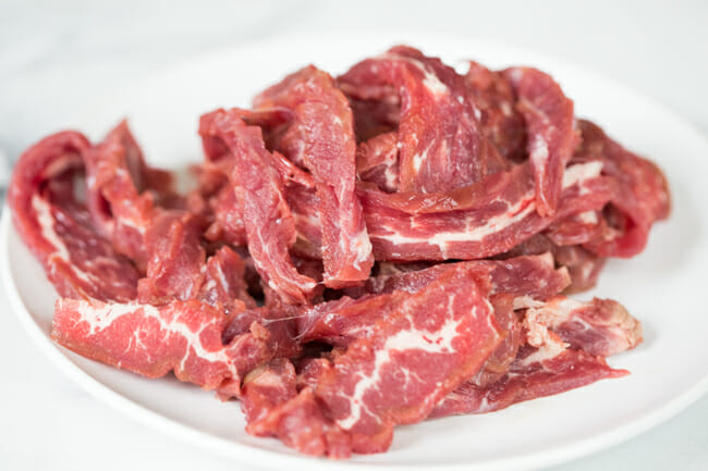 Thinly slice 12 ounces of flank steak (partially freezing it helps a LOT)