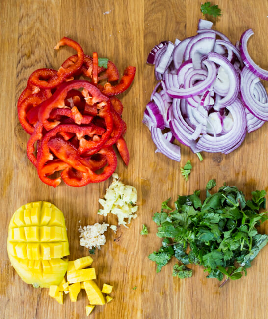Make sure your produce is prepped–a sliced red onion, a sliced red bell pepper, garlic, ginger, a mango, and fresh basil, cilantro, and mint leaves.