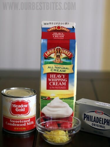 Mix the cream cheese, sweetened condensed milk, lemon zest, and whipping cream with an electric mixer until combined. Freeze for 4 hours or until semi-solid.
