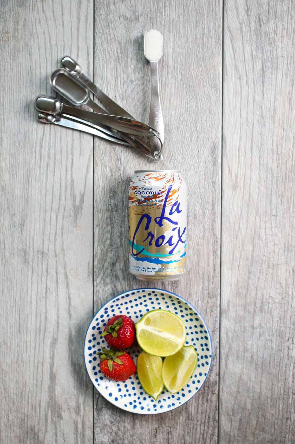 You’ll need a can of coconut-flavored seltzer water (I use La Croix), 2 medium strawberries, half a lime cut into 2 wedges, and a teaspoon of sugar.