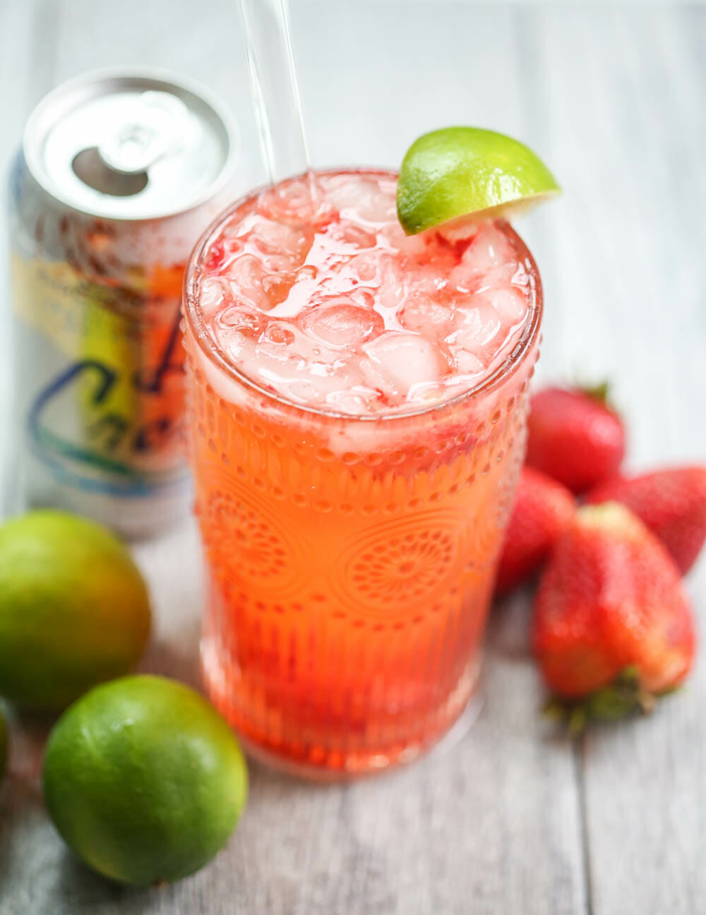 - Remove the stems from the strawberries and slice them into the bottom of a tall glass. Sprinkle with sugar, then let sit for about 5 minutes*. After it has rested, mash with a spoon until it's pulpy, then squeeze one lime wedge over the strawberry mixture and stir. Fill the cup about 1/2 full with ice, then add the coconut seltzer water and serve immediately.