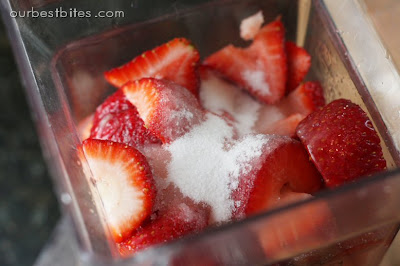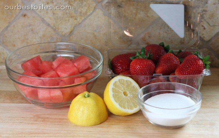 It wasn’t long ago that I was saying boo to summer weather and trading my oven-free dinners and ice cream posts for fresh baked cinnamon rolls. And while it’s still nice and mild here (hallelujah!) the sun has certainly been shining and I’ve finally been feeling the season. I know it’s already scorching hot where a lot of you are, so I bet you’ll especially appreciate this yummy slushie drink. And do you want to know a secret about me? You all know by now that I can’t stomach seafood, but you know what else makes me nauseous? Fresh watermelon. Weird, right?? I love watermelon candy and gum, and everything else, but I have a hard time eating the plain fruit. So a few weeks ago when I re-shot pictures for this Cutting a Watermelon Tutorial, I was stumped as to what to do with all of that juicy fruit! I stumbled upon this recipe and it was perfect. Combing the watermelon with strawberries was the perfect combo and my whole family loved these. (And then I went and delivered the other half a watermelon to a friend’s doorstep!)It’s pretty darn simple, and you might already have this stuff around. Just roughly chop some strawberries.