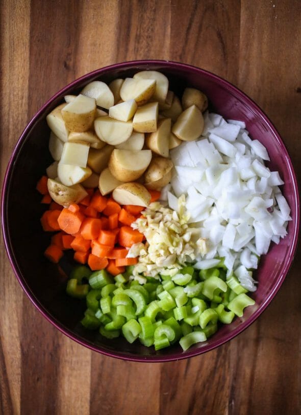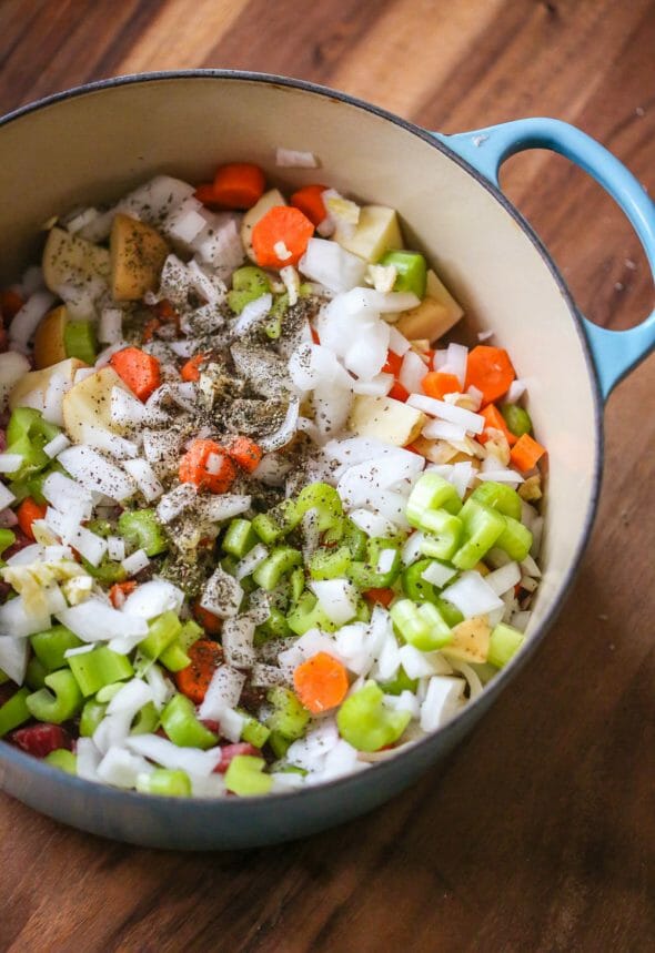 - Cut the veggies–I usually make the potatoes on the large side of bite-sized, the carrots and celery on the small side of bite-sized, and then the onions chopped pretty small because I don’t like them in chunks. But you can do it however you like! Combine all the ingredients in a large Dutch oven or other heavy oven-safe dish with a tight-fitting lid.