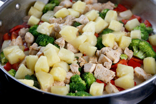 Then you can add your cooked chicken back in, and also your pineapple.