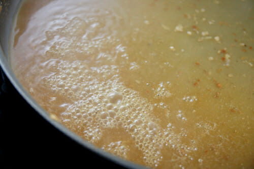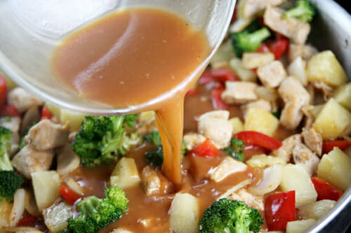 And now we’ll take advantage of all that flavor and de-glaze the pan! I’m using the juice from my can of pineapple to simmer the browned bits right off and add flavor to the sauce. If you’re using a non-stick pan then you can completely skip this step. The pineapple juice will just get mixed in a separate bowl with your sauce.