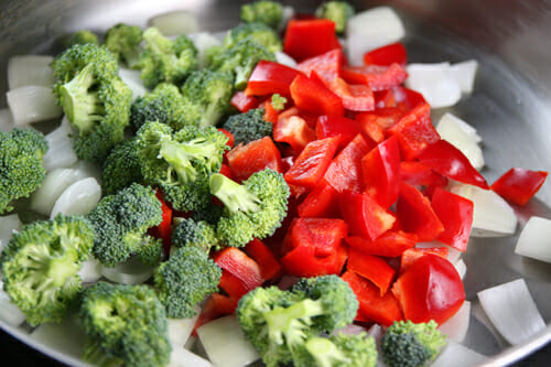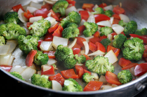 To your clean pan, add a drizzle of oil and some veggies. I’m using onion, broccoli, and red bell pepper, but really you can be fairly creative here and clean out the fridge.