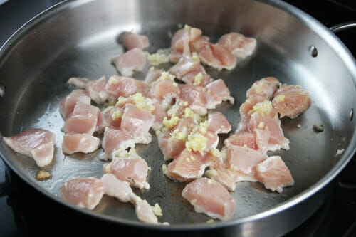 Now, start by sauteing some boneless, skinless chicken breast with some fresh garlic and ginger in a large skillet or wok. You could also use pork tenderloin, or chicken thighs. I’m going to give you a little hint about pans too. I’m using a stainless steel pan here because it’s easier to photograph than my black nonstick ones. If you use a stainless steel pan, you may have to add a little extra oil to make sure the garlic and ginger don’t burn. In a nonstick pan I never have that problem because there’s naturally a little extra moisture.