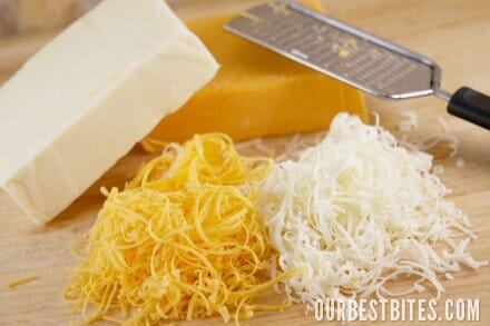 Lastly, in goes a little shredded cheese. Both Cheddar and Jack. Just a little tip- when I’m buying cheddar cheese for a recipe, like bread, or soup, or a creamy sauce, etc. I always buy medium or sharp, or even extra sharp. Even if you don’t like that sharp of a flavor when eating it plain, it’s usually much better in a recipe because the flavor is actually strong enough to show through. Mild cheddar tends to just add the creamy melty factor, but not a ton of flavor.