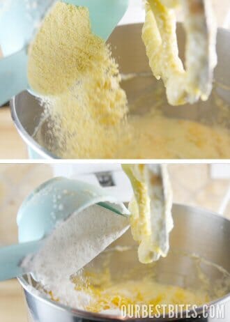 Then we’ll add that fresh cornmeal I just made (by myself! I’m practically superwoman!) and also the flour, baking powder and salt.
