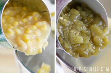 Then in goes a can of sweet, creamy corn and also a can of mild green chiles. Green chiles aren’t spicy, they just add tons of yummy flavor.