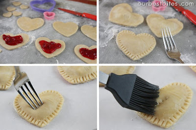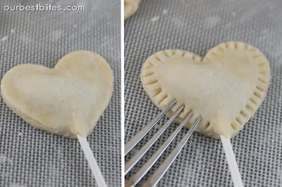 - Place about 1-2 tsp of filling on one cut out, keeping it at least 1/4 inch away from the edges. Place 6 inch lollipop stick in center of shape, with the top of the stick near the top of the shape. Wet your finger in a small bowl of water and wet the edge of the pie dough shape. Wet the edges of a 2nd pie dough shape (one without filling) and place on top of the other. Press together gently with your fingers to seal the pieces together. Use a fork to crimp edges, being careful to seal edges around the stick. Poke a fork into top of pie one time so steam can vent.