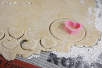 - Roll out pie dough on a floured surface about 1/8 inch thick. Cut out heart shapes (or other shape of your choosing) and place them on your baking sheet.