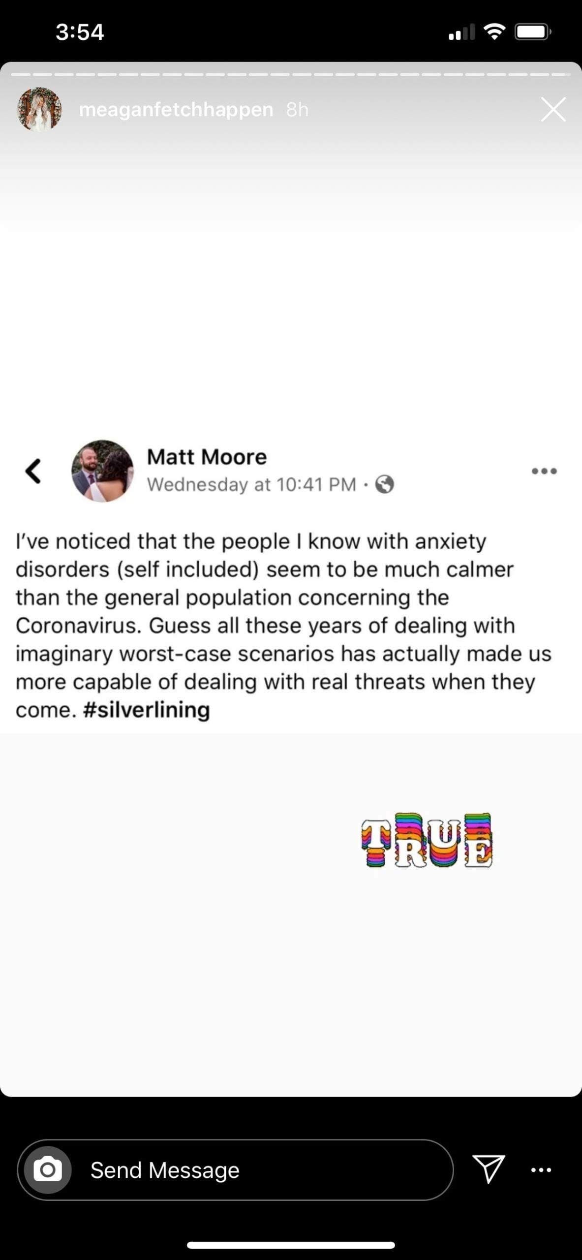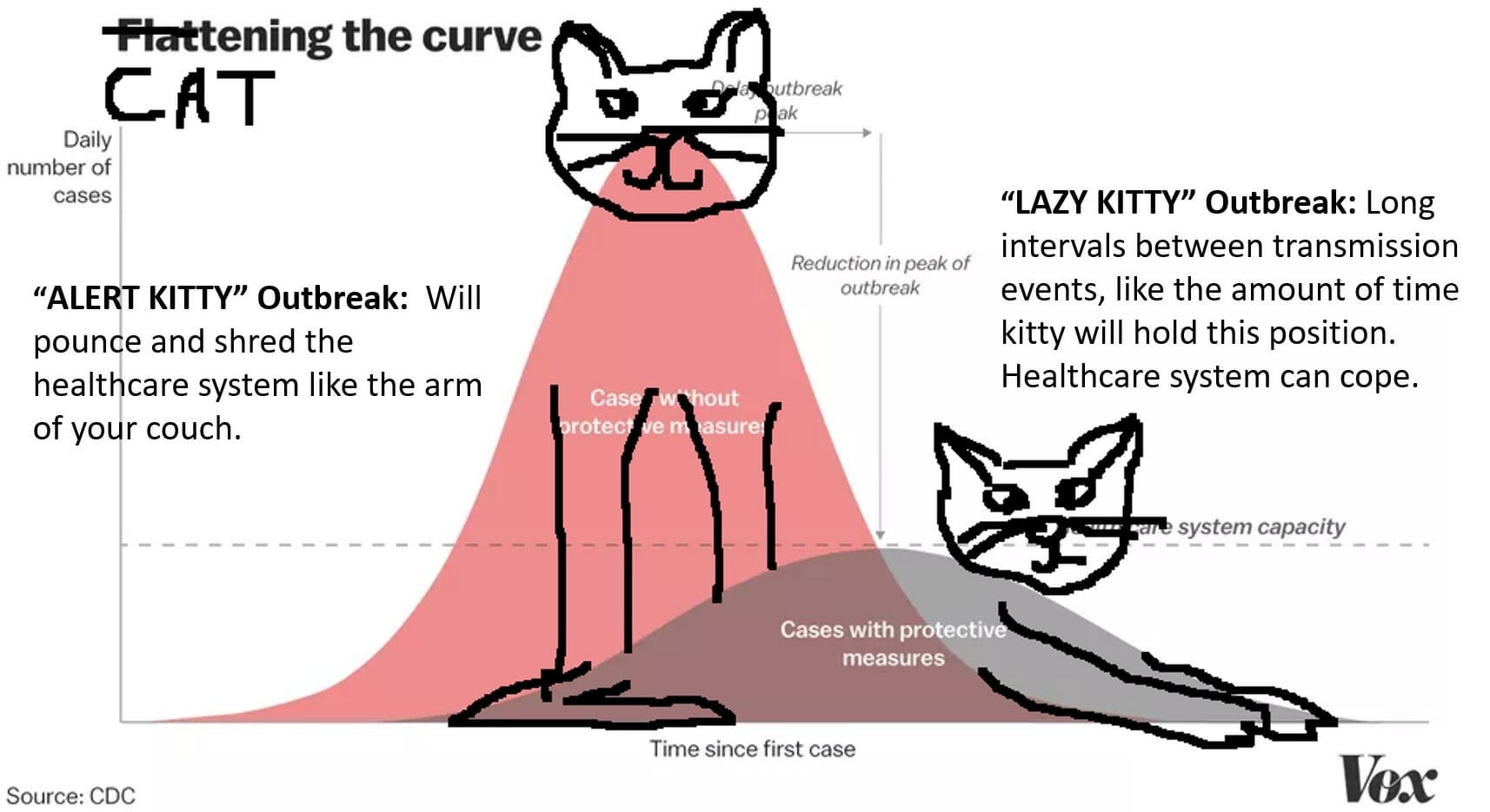 One great thing about living with perpetual anxiety for most of my life is that I’m pretty chill right now. It really is true that the scariest thing is the unknown, that the greatest fear is fear itself. I’m way less scared of coronavirus than I am of people losing their minds at the store (and also people who think this is a government conspiracy and there’s no reason to take any precautions.) Here’s a little graphic explaining CATtening the curve, if you’re not convinced that reasonable precautions need to be taken.