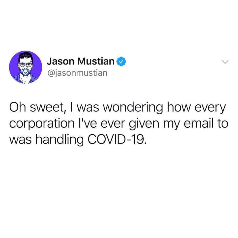 I don’t really need to know how that company I bought sunglasses from a year ago are trying to prevent me from getting coronavirus. (I can assure you that Sara and I are taking great steps to personally triple-sanitize every email we send out to you and that we promise to always stay more than 3 feet away from y’all.) But seriously, we want to share how we’re planning to help.