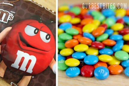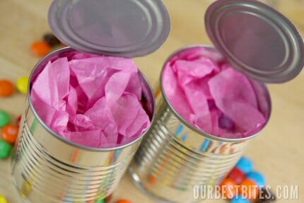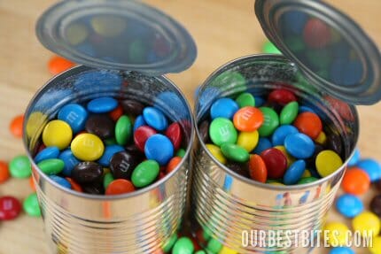 Leave about 1/2 inch of head-space at the top of the can. Another reason I use small cans is because you need quite a bit of candy to fill these if you’re using something small like M&M’s. But you could use little wrapped chocolates or candy bars or whatever.