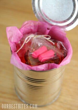At this point you’re ready to go! These cute cans are ready for giving, and people will be SO surprised when they open up the fresh can and find goodies inside!