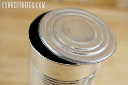 Tip: If you’re using a traditional can opener, make sure when you are removing your lid, you don’t remove it completely. You want to leave it attached at one point like seen in the picture above. Wash the cans well with soap and rinse clean. Make sure to dry completely.