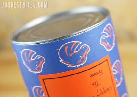 You can make these with any size can you can find with a tab top. Technically you don’t even need the tab top, but if you’re using my printables you do. Plus a tab is just way more fun! I like the little mini cans, the 7-8 oz size, which is about half the size of a standard tin can if you’re trying to visualize. Look for generic brand fruit in cans this size; they’re super cheap! Make sure to use cans from something like fruit or fruit juice. You don’t want the insides of your cute treat cans to smell like beans or chili!