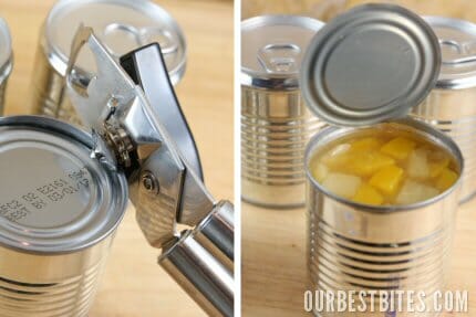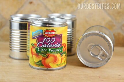 Step one: Remove labels from cans. Use a can opener to remove the bottom end of the can. It’s the side without the tab top folks! A side can opener works great here because you won’t have the sharp edges and the pieces will be a breeze to glue back together. If you plan ahead, you can eat the fruit along the way in your normal meals. If you plan at the last minute like me, you can dump it all in your blender, blend it up, freeze it in ice cube trays, and use for smoothies. Or it’s great poured right into Popsicle molds.