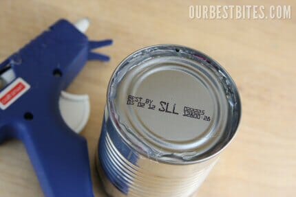 Step 4: Use hot glue to reattach the bottom of the can. If you use the safety can opener, this part is simple, and it takes very little glue. If you use a traditional can opener, like I did in these photos, it isn’t hard, but it’s a little tricky. I find it easiest to bend the lid back down flat and then fill in the open space with glue. This is why the tissue paper is there- to catch the glue that goes through so it doesn’t end up stuck to the treats.
