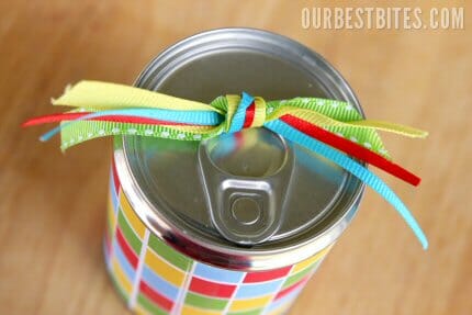 7. Tie decorative ribbons through the tab on top of can.