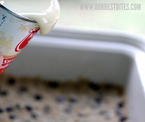 - Pour the sweetened condensed milk over the hot crust. Reserve ¼ cup of the toffee bits and pour the remaining bits over the sweetened condensed milk.