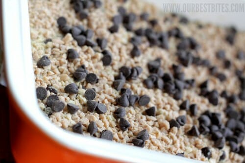 - Sprinkle the reserved dough over the toffee chips and then top with the reserved chocolate chips. Yes, I realize that I did not follow the directions and put things in the wrong order. It’s okay.