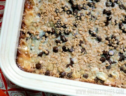 - Sprinkle the reserved dough mixture over the toffee bits and the remaining ½ cup chocolate chips. Return to the oven and bake for 25-30 minutes or until golden brown.