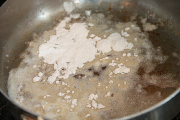 When the veggies are done cooking, you’ll take them out of the pan and then start a little roux to thicken your sauce. Melt a few pats of butter and add a few tablespoons of flour.