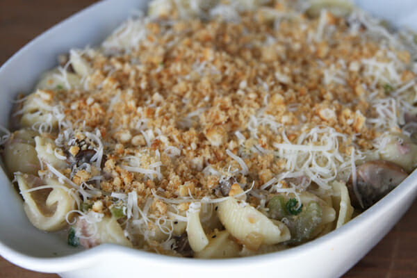 Last month when I was interviewed for the New York Times my conversation with the interviewer at one point got on the subject of foods from my childhood that I hold a fondness for. Without hesitation I started talking about casseroles. When I was a kid we ate lots of cream-of-something soup casseroles. As much as we like to get “foodie” around here, those retro condensed soup casseroles are some of my most favorite comfort foods and I still make many of them for my family. One of my favorites back then was tuna noodle. I’m sure my Mom made it the same way lots of people do, with cream of mushroom soup and cheddar cheese, and potato chips on top. That layer of crunchy potato chips melted into gooey cheese was my faaaaavorite thing. We’d always conveniently scoop our servings horizontally, as to scrape off as much of the topping as possible. Kate and I have gotten a lot of requests for a tuna noodle casserole over the past few years, and since one of my New Year’s resolutions was to cook more fish at home (seriously; lose weight, start doing laundry on a regular basis, and eat more fish. The only one I’m totally sucking at is laundry. I should stop making that goal.) I thought this would be a fun recipe to makeover.