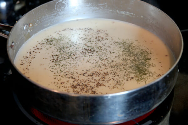 Whisk it until it’s nice and smooth and then add the liquid. I use a combo of chicken broth for flavor and milk for added creaminess. If you warm both the broth and the milk before adding it to your roux it will mix up a lot easier. Salt and pepper goes in the pot, as well as a hint of dried dill.