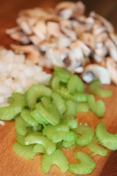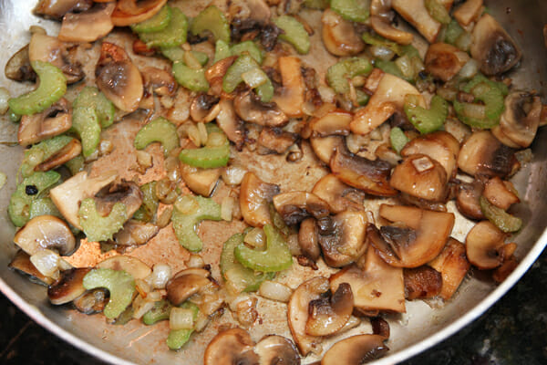 Melt 1 tablespoon butter in a large skillet. Add celery and saute for 2-3 minutes. Add onion and cook 2-3 minutes longer, stirring often. Add mushrooms and cook 3-5 more minutes, until mushrooms are golden and tender. If needed for moisture, add a drizzle of olive oil to the pan after the mushrooms are added; more if needed during remaining cooking time. Remove vegetables from pan and set aside.