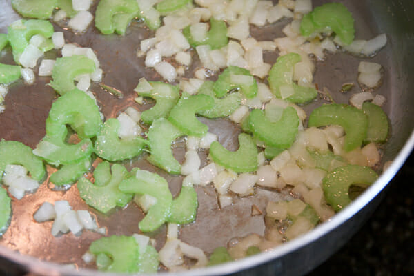 All three of these veggies take different amounts of time to cook, so I toss the celery in the pan first, with a little butter. Once they cook a little, then I add the onions,