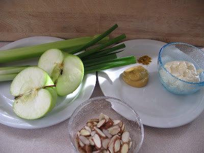 - In a bowl, combine a can of tuna, some diced celery, diced apples, and diced onions. Set aside.
