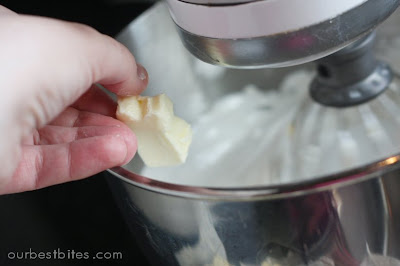 7. Now it’s time to add the butter. (Did I mention the finished product pretty much tastes like sweetened butter? Ya, yum.) You’ll want your butter to be at room temp and chopped up into cubes.