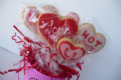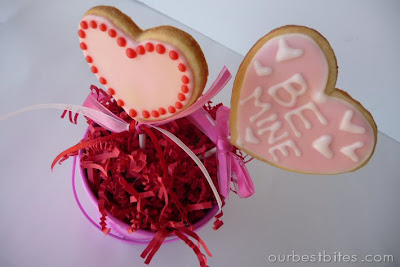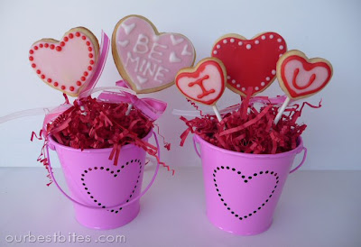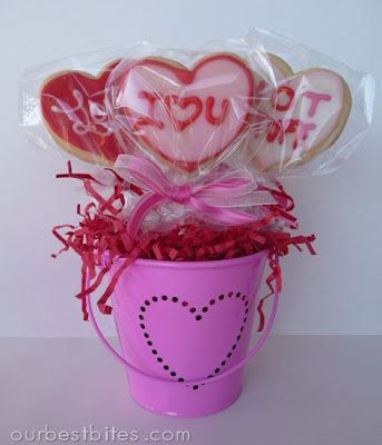 Or make a totally rad bouquet of cookie pops. Yup, I said totally rad. You just need a cute container- be creative! A vase, a cool mug, a cardboard box decorated with paper and embellishments, anything really. I got these little heart boxes, and the pink pails in the dollar section at Target. Cuz you know how much I love the dollar section at Target!