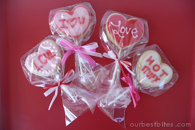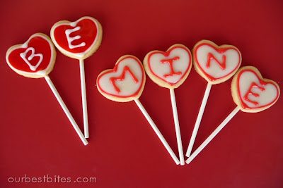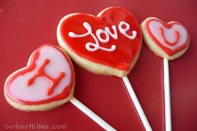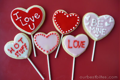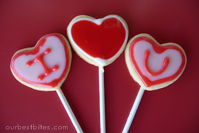 I think of all the cookies I did, these little mini hearts below are my favorite. They’re only about an inch and a half wide and they looked so cute on those little sticks. You could write someone’s name out, put on a little phrase, or just do plain hearts. These are perfect for little fingers. (Or big fingers, since you can justify eating more of them 🙂