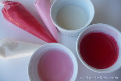 Icing: I made one batch of Glacé Icing and it was plenty for one batch of sugar cookies. I divided my icing (remember, at first it’s in glazing consistancy) in half. I took one half and divided it into 3 bowls. I left one white, did one pink, and one red. That’s for the glazing. I took the other half and added more powdered sugar to make it suitable for piping. I then divided that in 3 and colored them white, pink, and red as well. I used disposable plastic piping bags. So now I have piping icing and glazing icing in all 3 colors. I used Wilton “No Taste Red” gel color (available at cooking and craft stores, also Walmart). It took just a smidge for the pink, and not a whole lot more for that brilliant red.