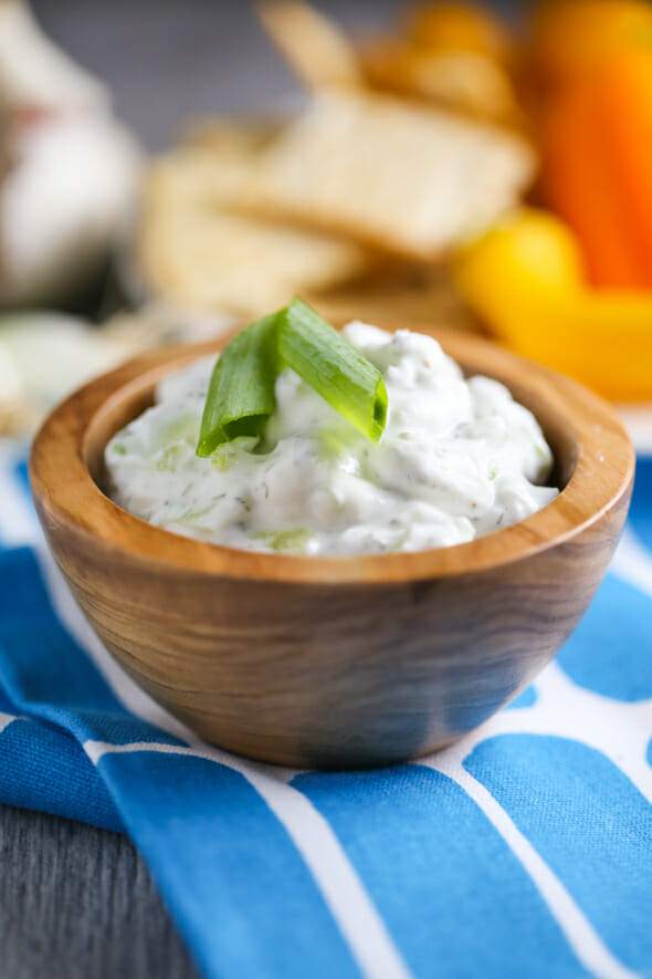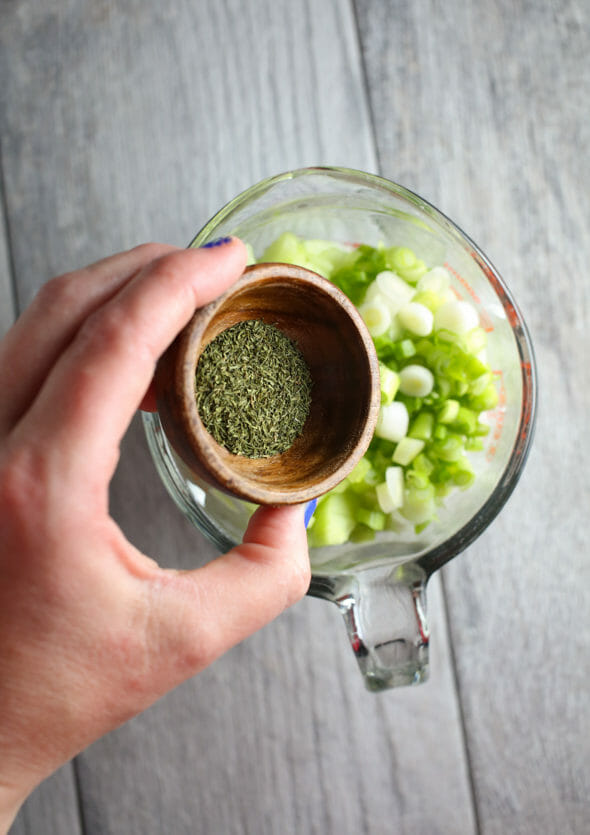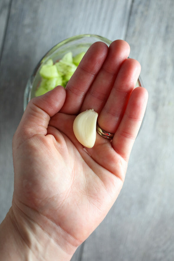 - Chop your cucumber and some green onions and mince a clove of garlic. Combine these with some dill (fresh or dried– it’s one of those rare herbs where it tastes very similar and measures the same in either form!) and season to taste with kosher salt and black pepper. Then try to stop eating it, I dare you!